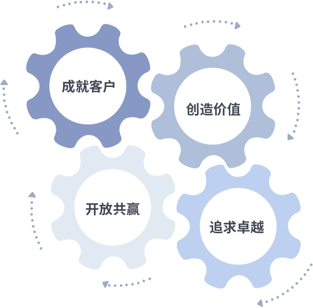 成就客户是一切决策的出发点,,,,创造价值是衡量所有工作的标准,,追求卓越是我们做事做人的态度,,开放共赢是我们的格局也是最终的结果。。价值观的齿轮环环相扣,,推动着组织里的每个人不断向前。。。。