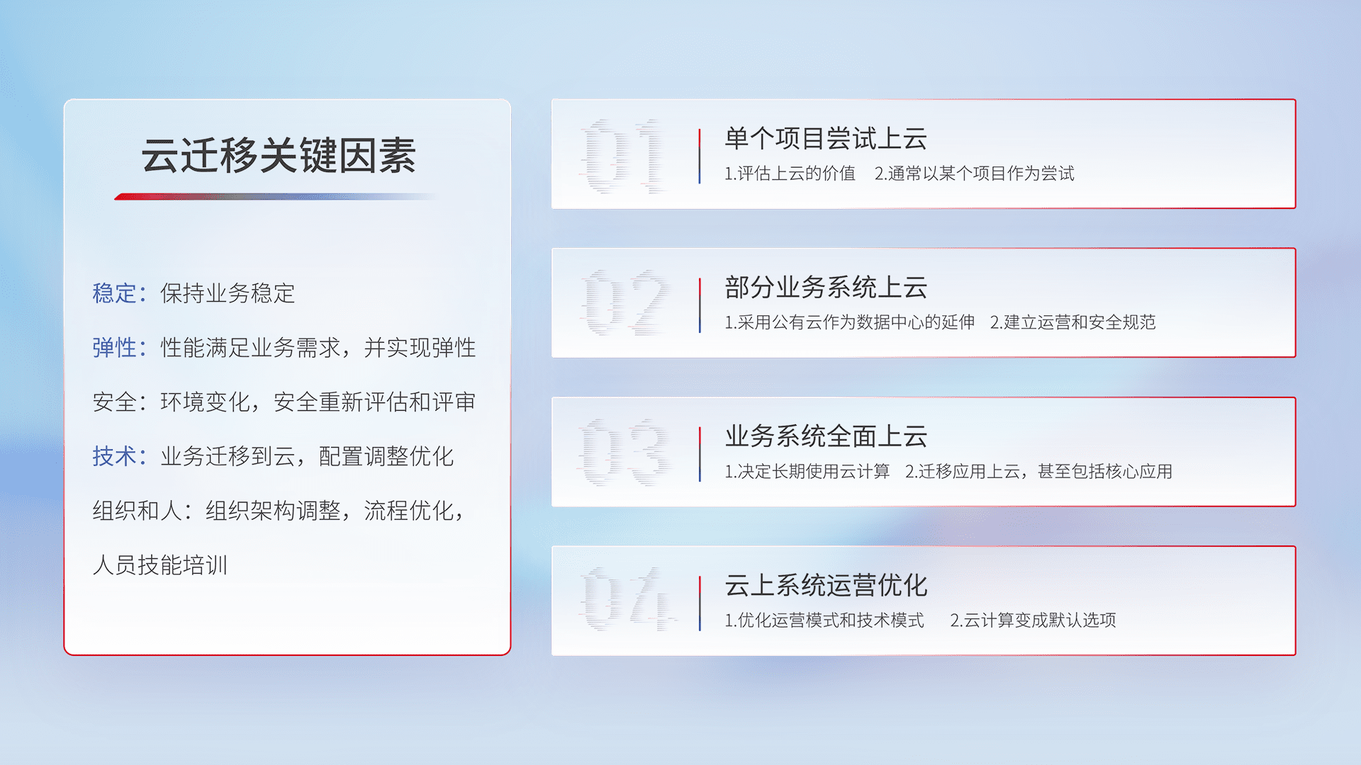 结合实际业务,,从规划设计、、、云平台选型、、云原生改造、、、、数据迁移、、、集成交付,,,,迁移全过程为客户识别最佳上云路径,,做好风险识别管理,,,,设计网络架构、、、、身份权限、、、安全审计合规、、、、操作审计、、、、日志审计、、、监控告警策略、、多站点容灾设计等,,,,对云上基础设施进行整体规划,,提升IT治理水平,,,,以满足弹性、、高可用、、高性能的需求。。。。