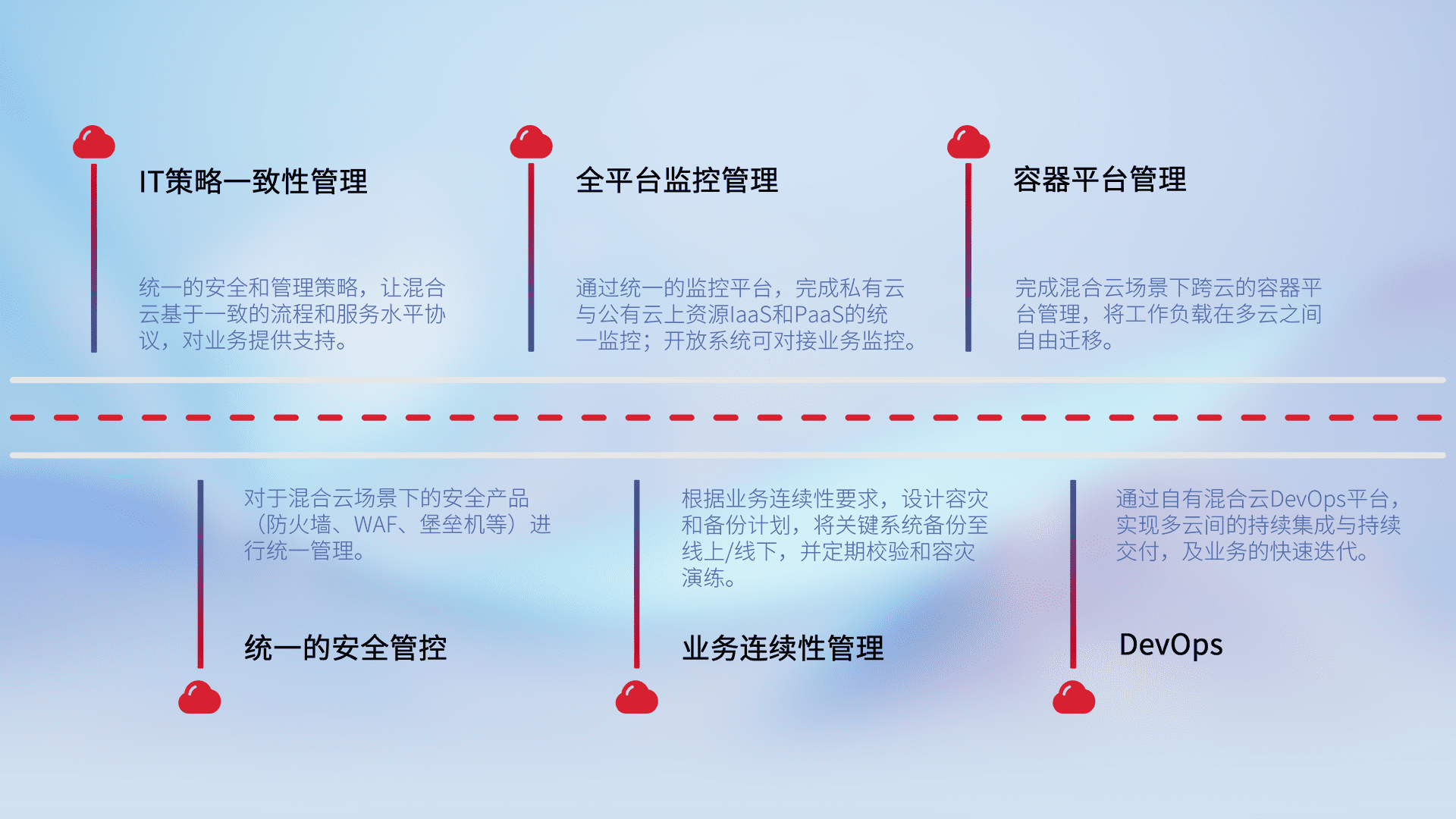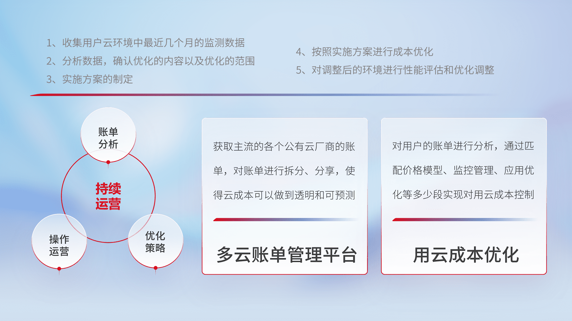 通过多云纳管,,,以统一的资源数据模型把客户的云资源进行抽象和封装,,,进而实现对多云资源的统一操作,,,保障云资源管理的可靠性、、、稳定性与可用性。。。量身定制化运维内容,,配置、、、、开发运维、、、补丁管理、、、、备份、、、监控、、、、认证和访问管理、、、、审计和日常巡检等,,,保障在用云过程中的可靠度,,,,稳定度以及高可用率。。。